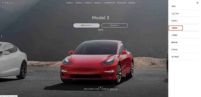 特斯拉官网,右侧菜单栏-问题解答