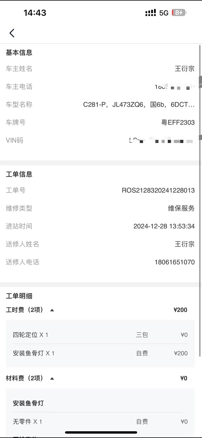 六、改装费用清单,我是从长安官方那边参加活动获得的鱼骨灯改装件,所以成本是0元,要是购买的话价格应该是在600-700元左右,然后安装费用是200元,在长安4s店里面安装的。
