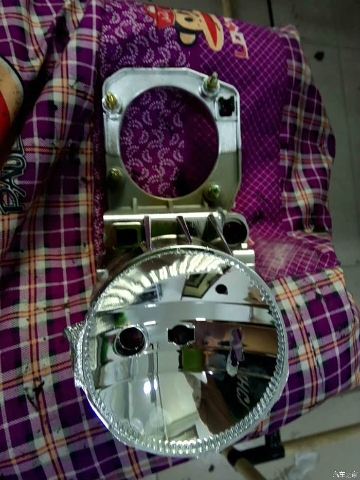 远光打磨好的灯碗,令外把原厂进光一套拆开后只用透镜,把原厂的遮光片打磨掉,原来的近光透镜底座就不需要了,然后找好位置打孔 四个孔去固定它,用耐高温胶胶好去固定好 。