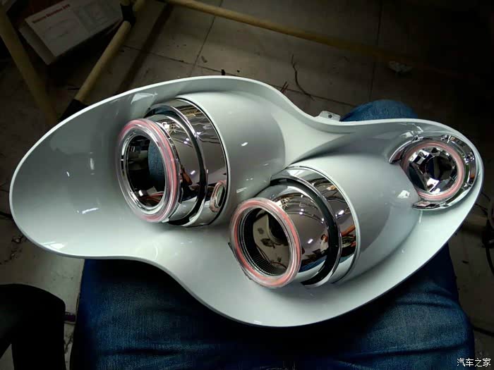 2. 这个前罩子加天使眼的效果, 把原来的 黑罩子烤漆成白色,这样光效会好一些,天使眼位置转向灯黄色灯罩取了,都需要打磨. 效果不错吧 !恶魔眼是 卡在透镜里面的。