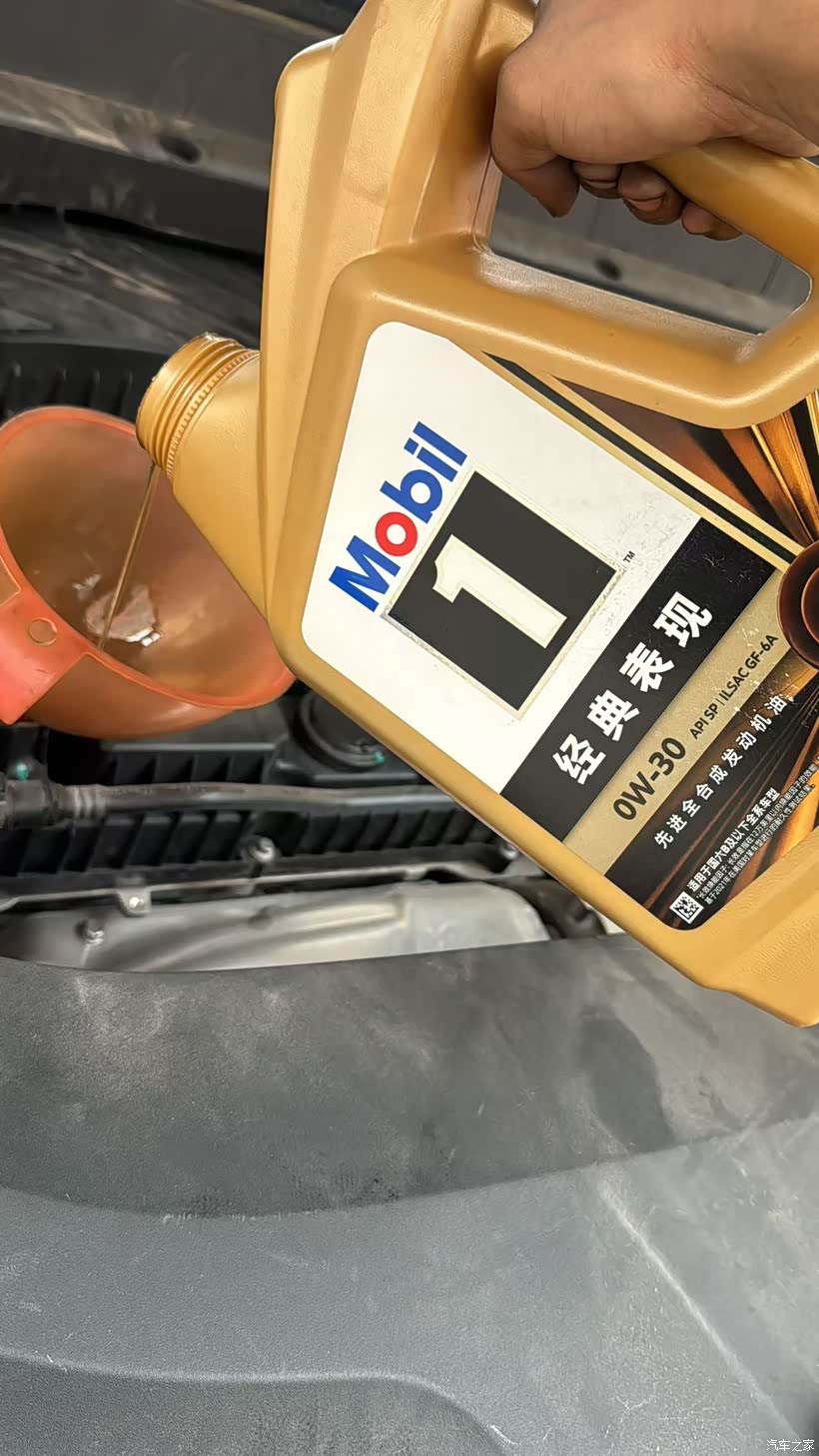 放出旧机油,更换全新机油滤清器,加注金美孚1号 0W-30全合成机油。全合成机油能有效清洁发动机内部积碳和油泥,为高精度部件提供卓越保护,减少磨损。