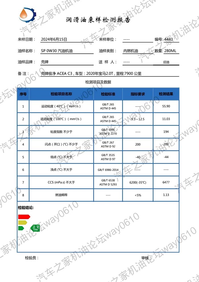 本次检测的机油是壳牌极净超凡喜力0W-30 C3,使用的车辆是2020年宝马730 2.0T,B48B20B发动机。用油时间24年1月至6月初共6个月,跑了7900公里,车辆总里程43600公里。用车地点湖南,行使路程约900公里市区,1000公里国道,6000公里高速,路况很好,驾驶习惯经常高转地板油,暴力驾驶多次6000转以上,导致机油消耗过快,电子机油尺到低线,添加了1升机油。使用中石化95号汽油,用了4瓶宝马原厂燃油添加剂(赢驰代工)。