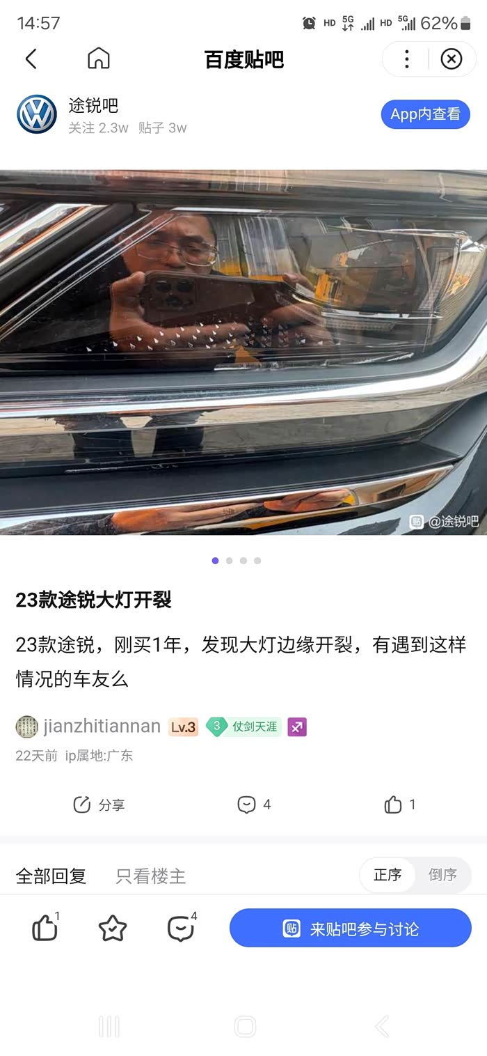 2025年4月15日,偶然发现一侧车灯内发生部分脱落,第一时间联系4s 店并到店检查。4s 店给出检验结果:大灯外表无坑划痕,无其他异常,判断为大灯内部炸裂。4s 店将检验结果联系大众中国。大众中国技术部称:其实验显示外部热源烘烤可能导致大灯裂痕。经4s店反复沟通,大众中国技术部的意思是可能是贴车衣过程中热源接触大灯导致。了解这一情况后多次和4s 店和大众中国解释:购车为2022年7月1日,贴车衣为同年7月20日,品牌XP,系统可查。22年10月大灯发生灯融,更换双侧大灯,后又灯融,23年7月25日更换双侧大灯。此次发生内裂的大灯根本就不是贴车衣时的原车灯。多次向大众中国表示随时配合其检测或第三方检测,大众中国既不按承诺履行三包责任,又拒绝检测。无奈之下要求其提供德国大众邮箱或其他联系方式,希望能直接向德国大众反映情况。可笑的是大众中国称无德国大众邮箱或其他联系方式。大众中国是和德国大众完全脱离关系了吗?索取德国大众联系方式未果后,要求接线员告知大众中国在北京朝阳区的具体办公地点,其称只能告知在朝阳。笑哭,大众中国不应该是为车主服务的机构吗?办公地点都需要保密吗?你这是什么保密机构吗?如果不是心虚,这些不是应该公开的基本信息吗?从购买第一辆车到人生第三辆车_途锐,出于对大众的信任和情怀,根本就没考虑过其它品牌。结果就是你待它如初恋,它虐你千百遍。大众中国你可以耍无赖,我只想说,此车之后无大众!