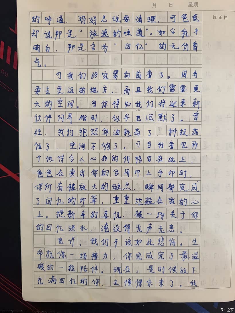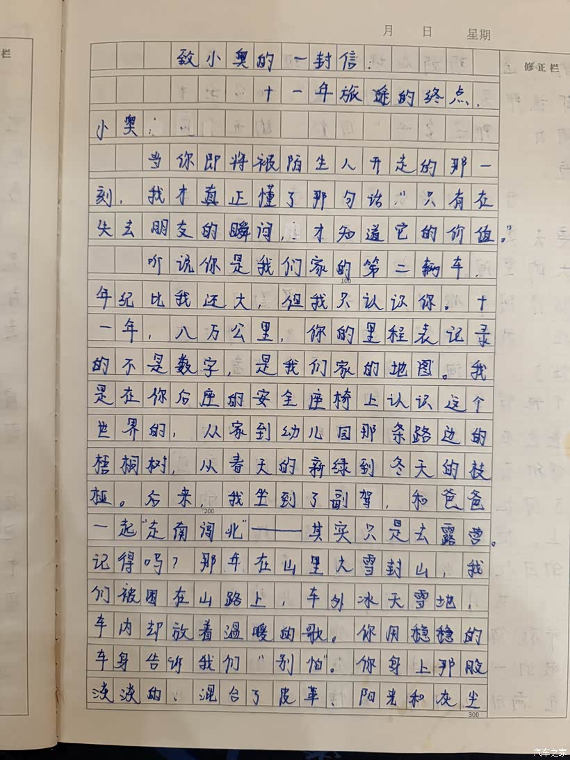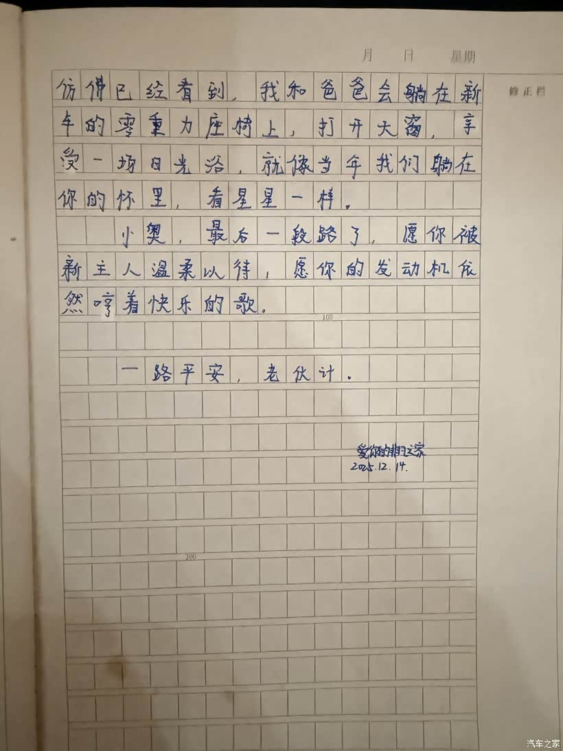 这些都不是今天的重点,选好新车后,陪伴11年的小奥变成了鸡肋,一个屁股只能驾驭一辆车,于是卖车,置换成了唯一的选择。尤其是一直被他陪伴的十岁的儿子,十分不舍,带着他选车,试驾,还见证了我卖车的全过程。感慨之余让其作文一篇以表心迹。没想到写完之后感动我了,和小奥竟有如此深厚的感情,在历经换车的不舍和新车的惊喜之后,也希望他和小8延续这段美好的故事。