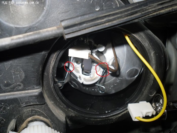 拔掉灯泡后的线束,可以看到三个固定灯泡的弹簧片,