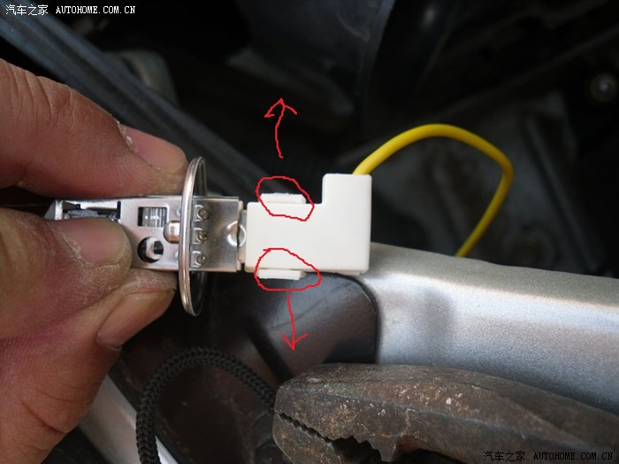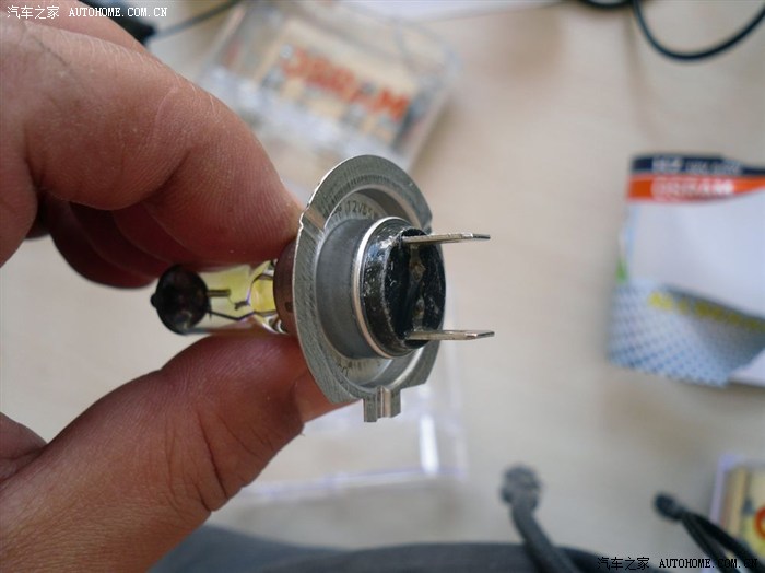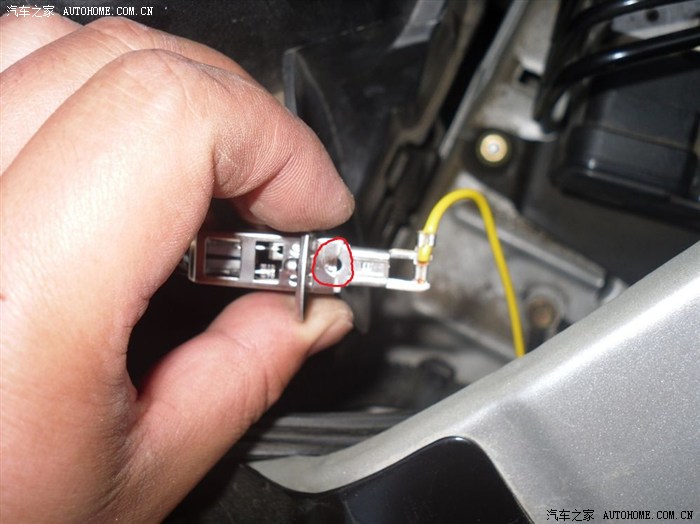 拆开护套后,看到灯泡插脚和接头没,那个小孔的位置需要一个细些的东西顶一下才能拔下来
