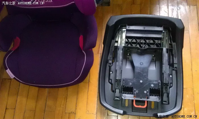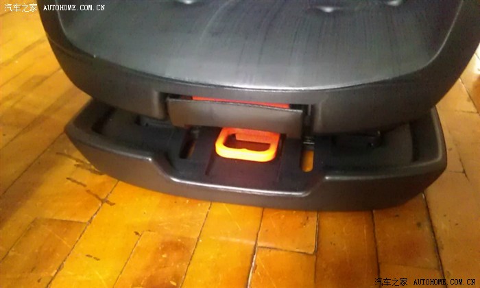 底座正中,有上下两个桔红色 拉手,底下的用来调节isofix连接杆的长短,上面的用来滑动座椅调整倾斜度的。