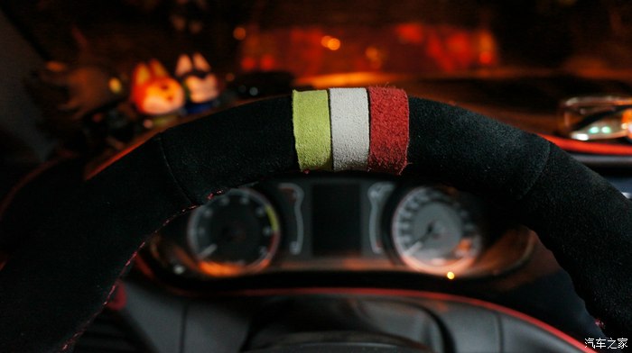 淘宝上其实有现成的款式,不过我不满意它的接缝位置,手握时会摸到,不舒服,另找人定做,将接缝上移,接近于原厂真皮方向盘的位置。并加缝了意大利国旗三色带,也是反绒材质。