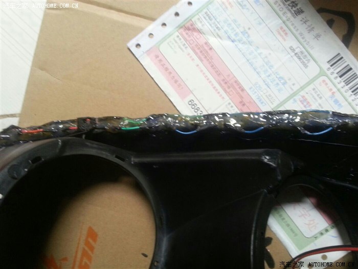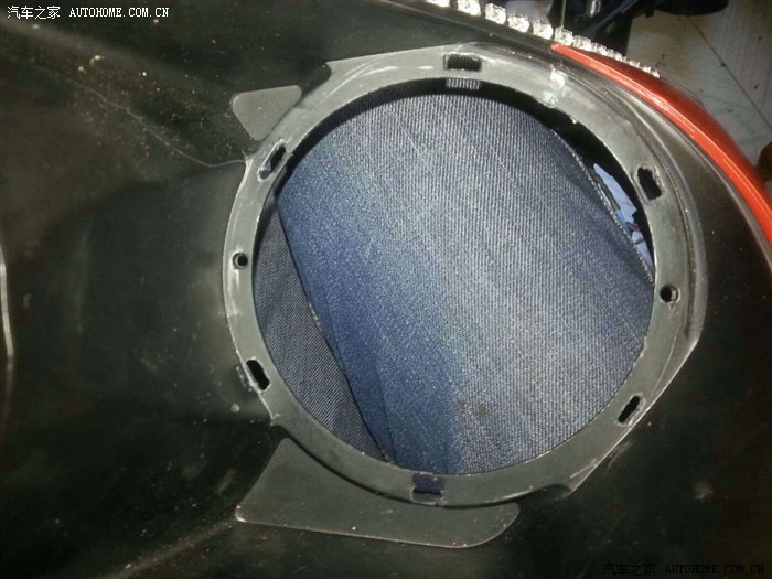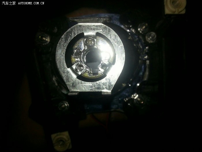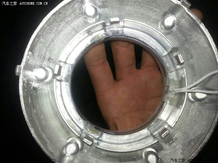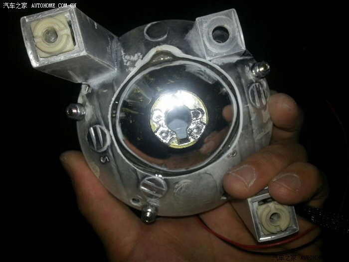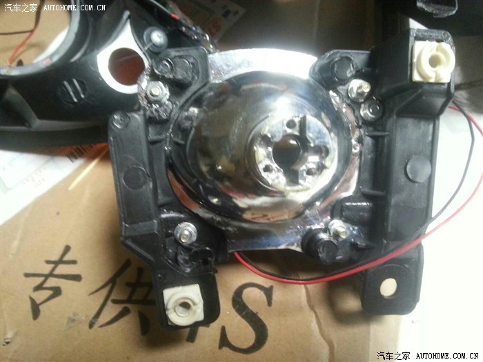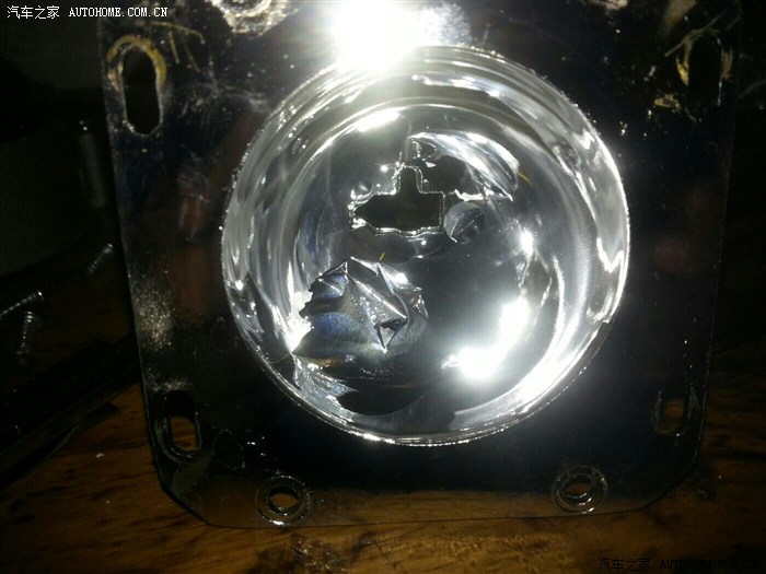 拆下的原车近光杯,里面的反光电镀让疝气灯烤烤就掉下来了,本想只加两远光透镜,看来我太高估原车透镜的质量了