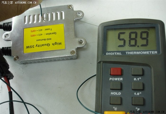 此时测得安定器的温度为58.9度,也属正常。明眼的兄弟看到海蓝星安定器上的这个贴纸就知道,其工作温度为负40-105摄氏度!