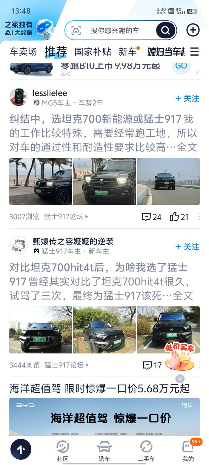 选车时我主要关注的是中国品牌,毕竟这几年国产车确实进步挺大,性价比也比合资车强很多!所以经过一系列对比排除后,我打算在坦克700hit4t与猛士917中选择。