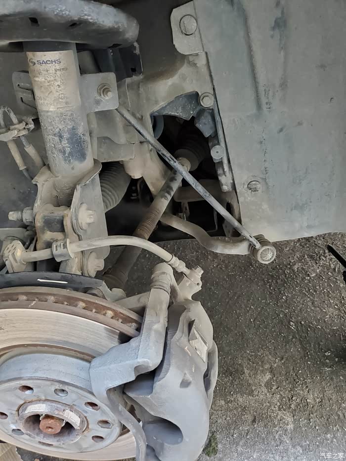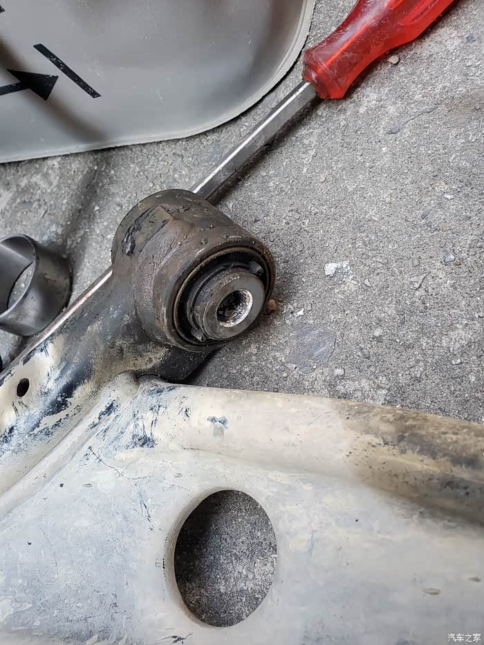第三,装摆臂时先把中间衬套和球头那里装上去,上螺丝不要拧紧。然后垫块小木板把车轮顶起来,刹车盘通风孔插个螺丝刀卡在刹车泵边上(图片没拍出来)要不然轮子会转动。要顶多少可以观察边上衬套的状态,这个胶套平了以后也比较好上螺丝,然后再拧紧所有螺丝,顶轮子下摆臂更好装,而且装出来的衬套比较平衡,扭曲度小,车子顶起来车轮下降很多,如果不顶车轮直接拧紧螺丝,到时装好轮胎下地以后轮子上升,胶套就是扭曲的,开车过程中路面不平产生扭曲程度就更大,胶套很快就废了。