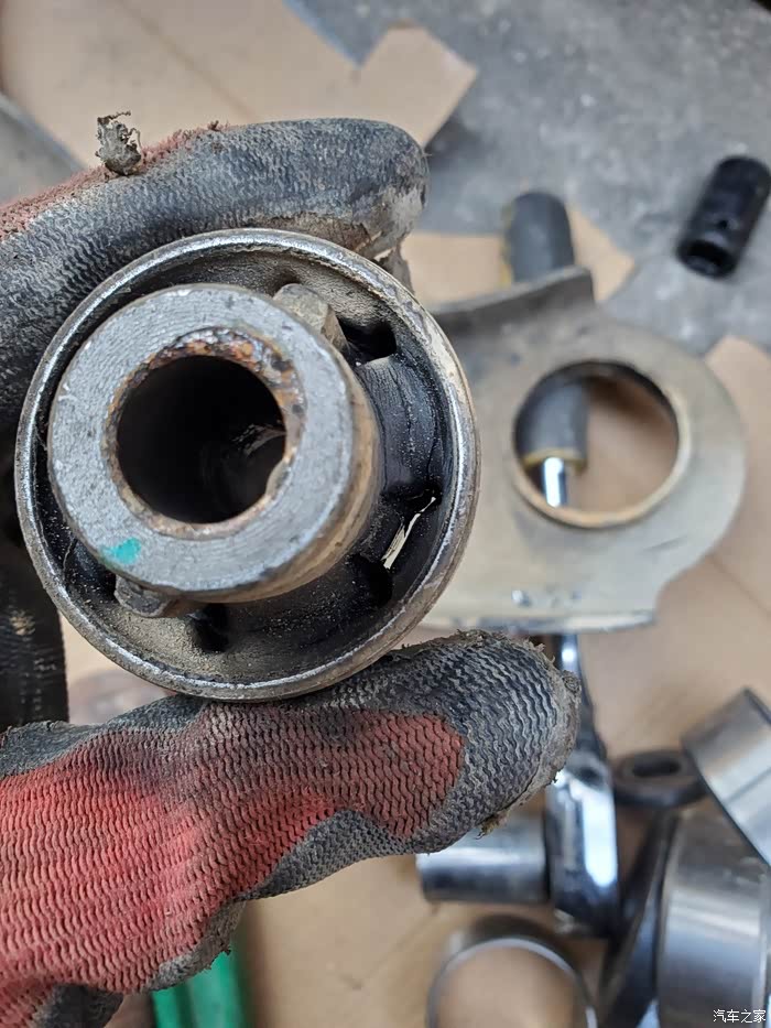 边上的衬套有开裂,但是没脱离,撬得动,也感觉换早了,再跑5w完全没问题。