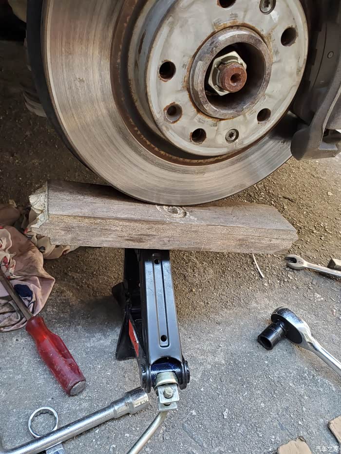 拆装摆臂比较费力,特别是装的时候比较难对孔,要慢慢摸索。最好有两个千斤顶,只有一个的话把车顶起来后用砖头或者木墩撑着车身,千斤顶拿出来,拆装摆臂要用到。