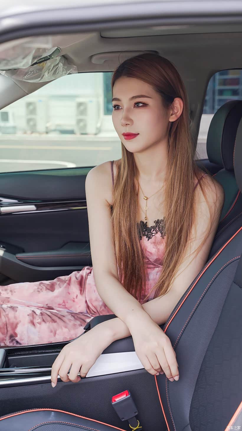 小琪斜靠在后排座椅上,抚着头发,透着优雅感。