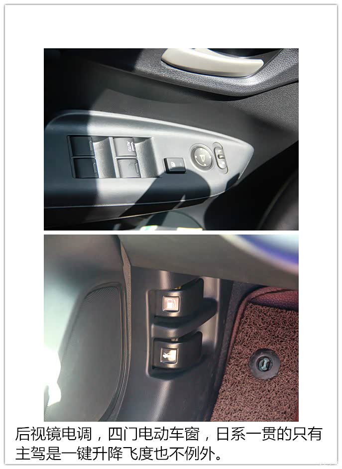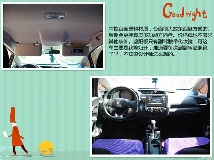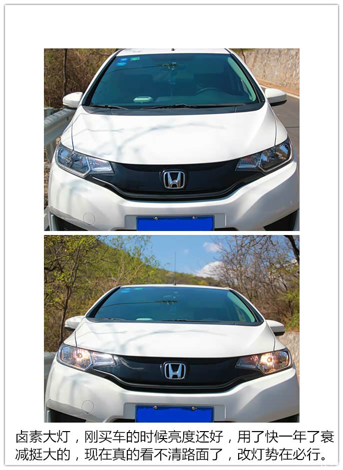),冬天早上冷车启动链条敲铁的声音出现过几次,不是经常出现,看网上处理这个比较麻烦也没去弄,天气暖和了也没出现过先不管它了。地盘过减速带的时候感觉很松散,有待提高。飞度的卤素大灯新车提回来时还可以,现在感觉有衰减,照明效果变差了,改灯势在必行了。低配没有前雾灯,厂商真的很坑,这是安全配置也减掉,希望国家完善法律规定,强制要求汽车装备雾灯。内饰一水的塑料当然售价在那摆着。