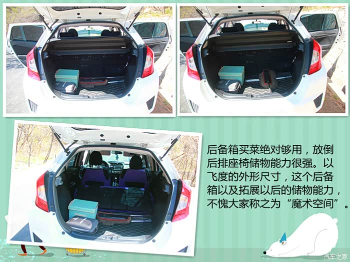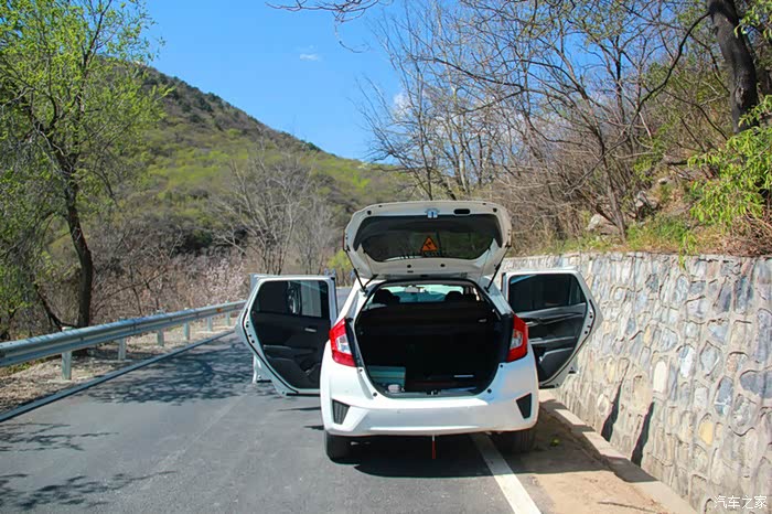 空间方面是个意想不到的惊喜,毕竟是辆小型车也没对空间有多大奢望。见到实车坐进去调好前排座椅,我开车座椅调的比较靠后,到后排坐进去前本想着应该顶着前排座椅,没想到我多虑了。这么小的车竟然有近乎中级车的后排乘坐空间(如:君威老迈腾等),再到后面打开后备箱,储存空间也没有让我失望,很多车友用飞度拉货。