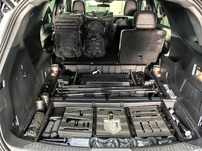 空间重构是昆仑穿越版(5座)的点睛之笔。依托近3米的超长轴距,它以七座车尺寸打造五座布局,带来越级宽敞的驾乘体验——第二排头部与腿部空间充足,美式大沙发般的座椅支持电动调节、加热与通风,长途乘坐也毫无疲惫感。二三排座椅放倒后,瞬间拓展出近6㎡的纯平空间,秒变露营大床房;常规状态下1505L的后备箱容积,放倒二排后更是暴涨至2487L,滑雪板、自行车、帐篷等户外装备通通轻松容纳。此外,置物板下隐藏储物盒与15处后备箱储物格的细节设计,让零碎物品收纳井然有序,堪称移动的户外仓库。