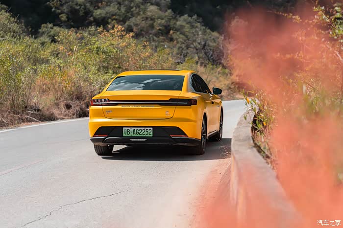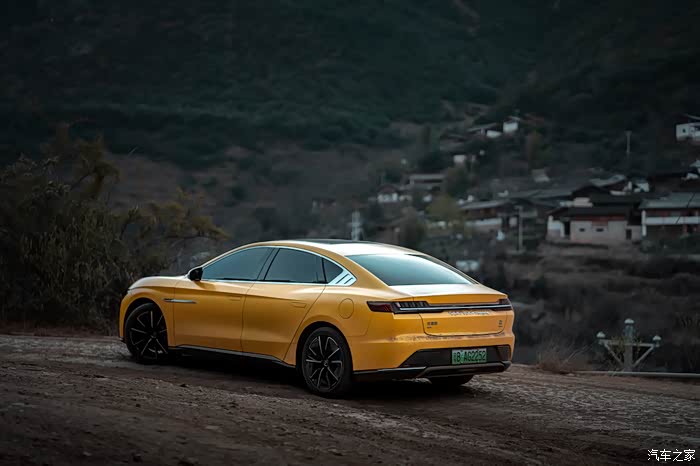 在侧后方看,比亚迪的车身线条分明,动感十足,这曲线使得比亚迪汉的风阻系数极低,为0.233。大家可能对这个数字没概念,目前进入0.235风阻系数的量产轿车全球不超过10款。