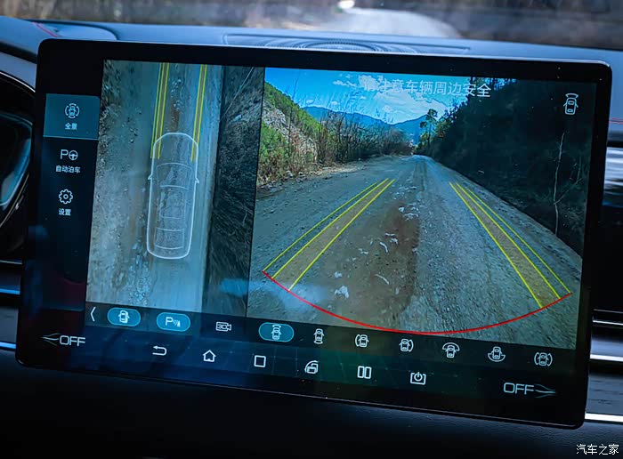 因为上坡下坡的土路比较多,我习惯的打开了360全景影像,把车身调节为透明,这样可以看到可能在视线盲区的石头,避免大石头跑到底盘下面刮坏底盘。