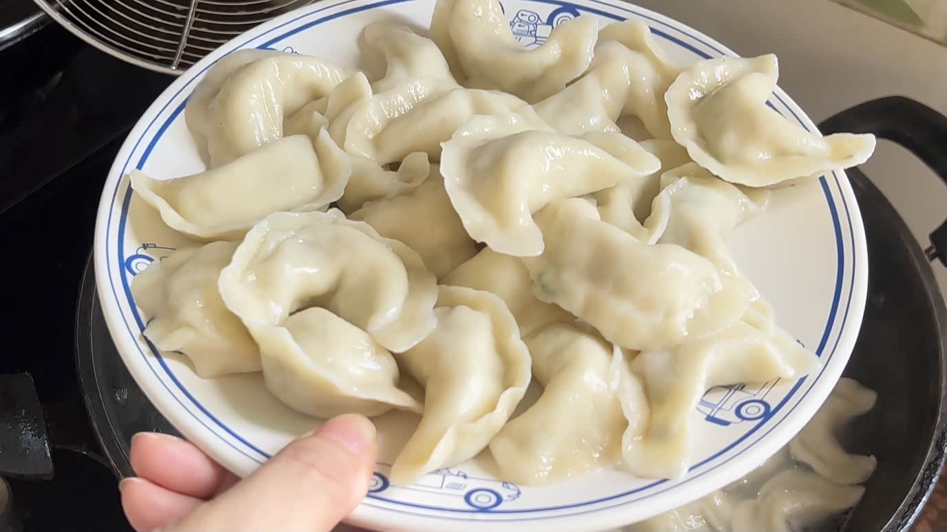 煮饺子:饺子包了一盘,一个个非常饱满。