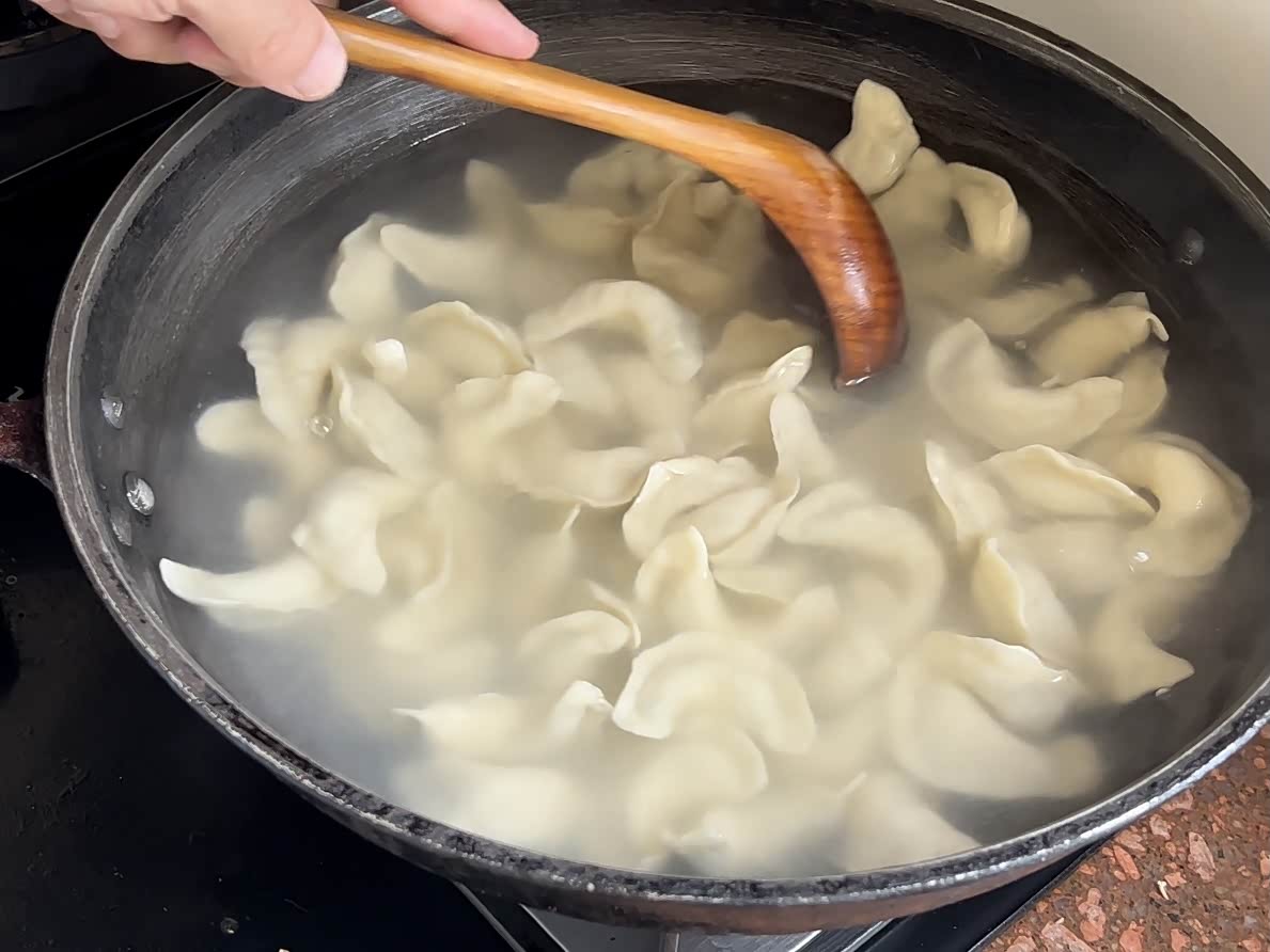 等水烧开后,就可以倒入饺子,饺子全部浮上水面的时候就表示熟啦。