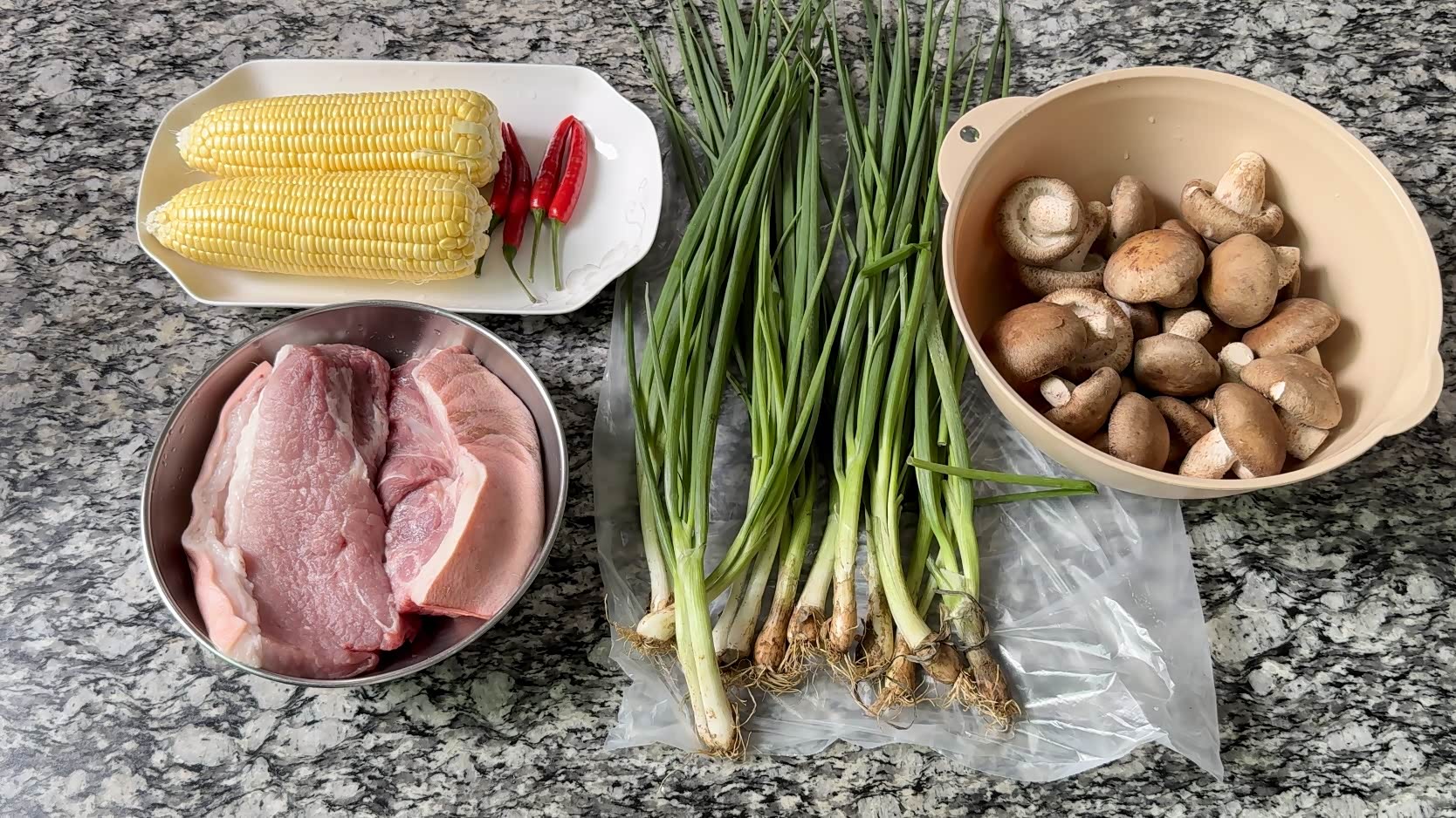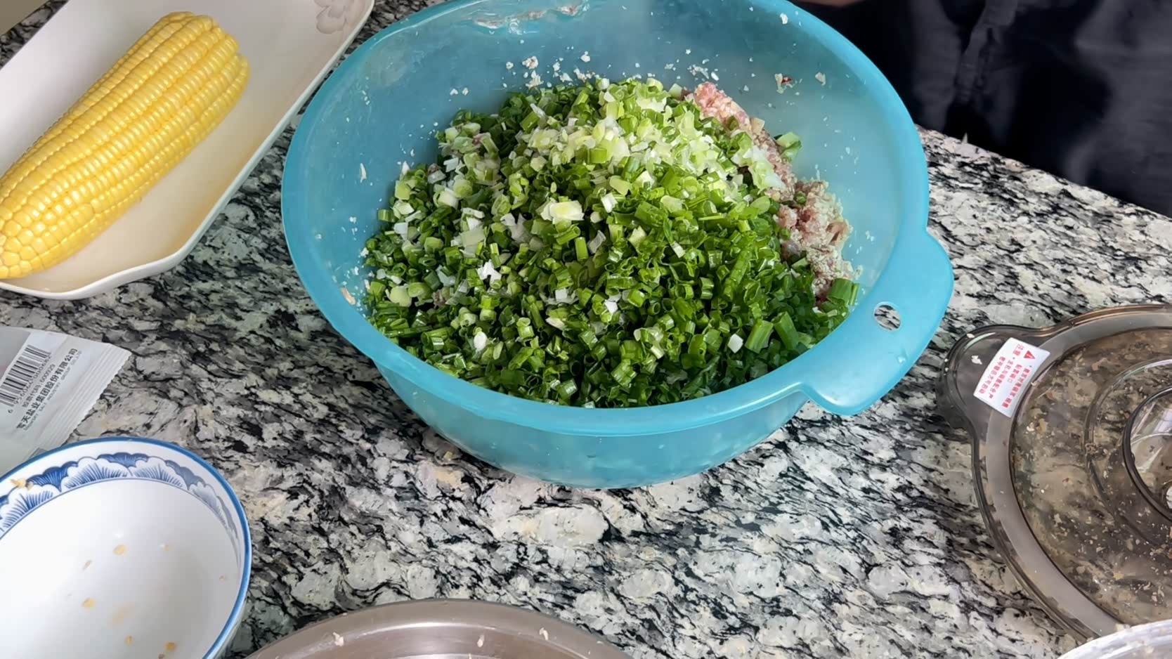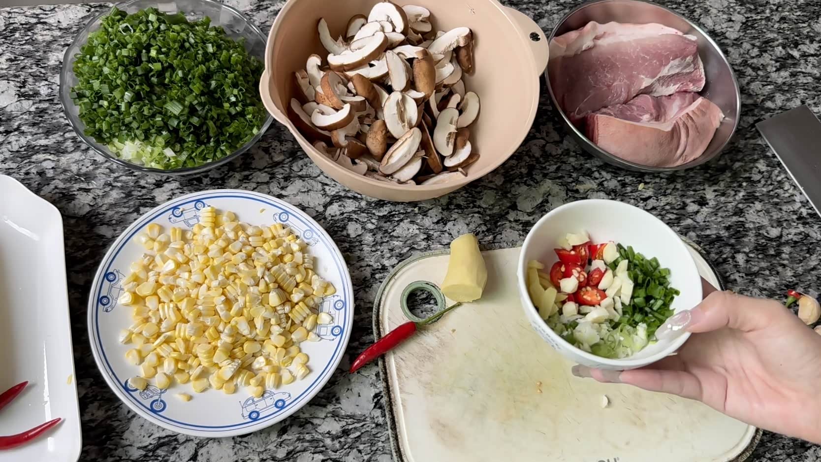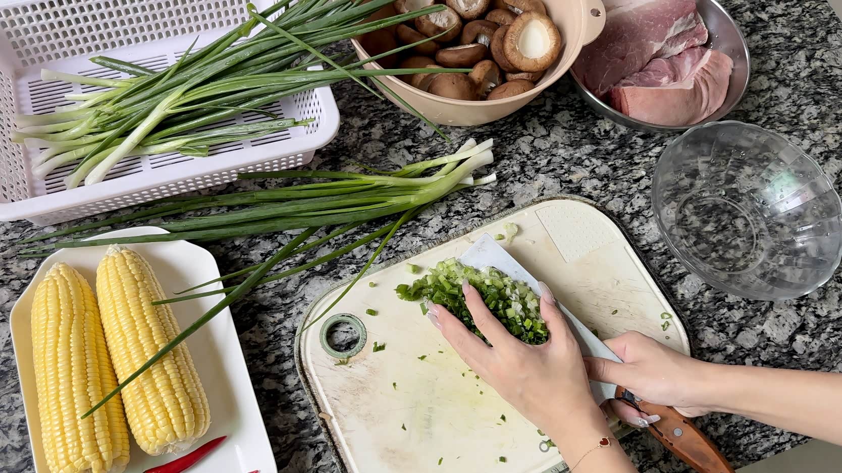 这个周末打算和家人一起包饺子,去超市把食材买了回来:猪肉、小葱、玉米、香菇这些。