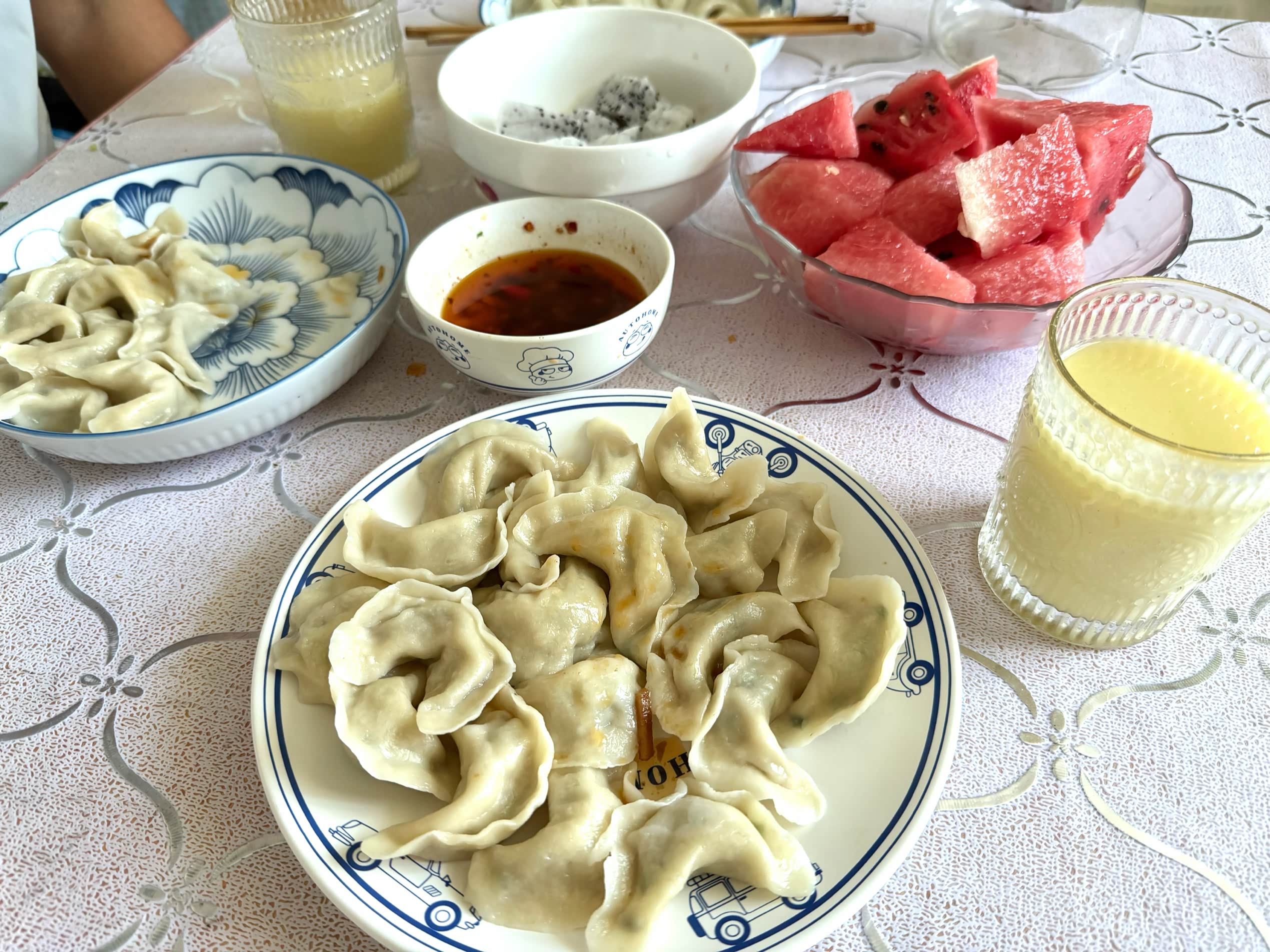 中午的菜单:猪肉玉米饺子、玉米汁。