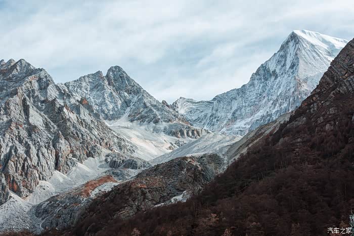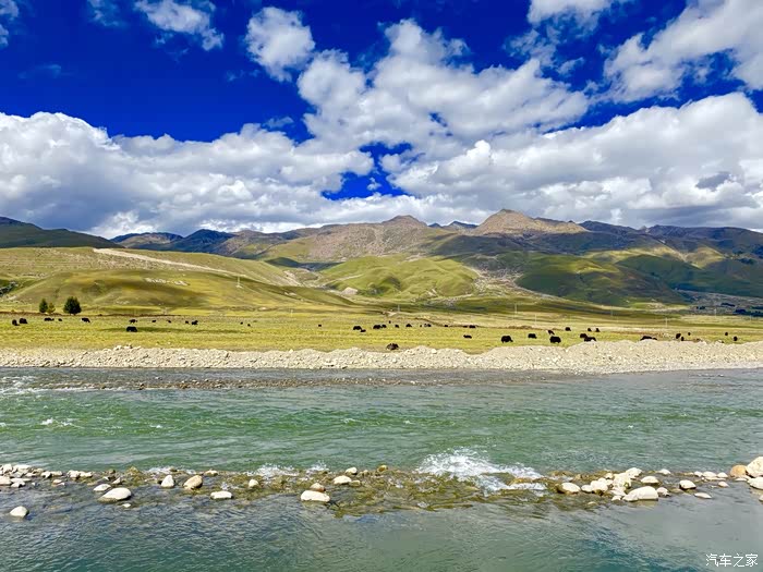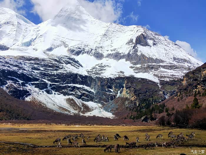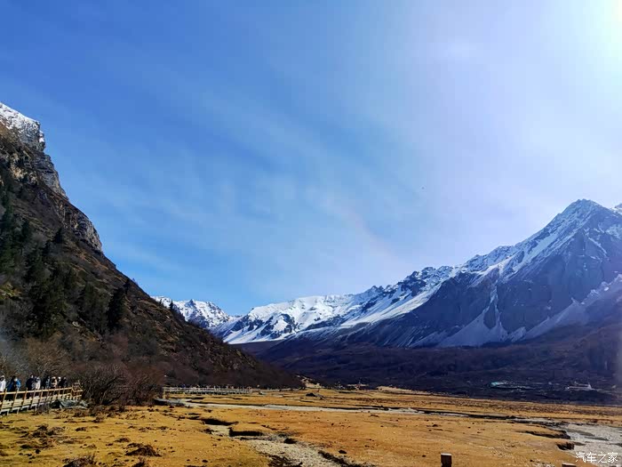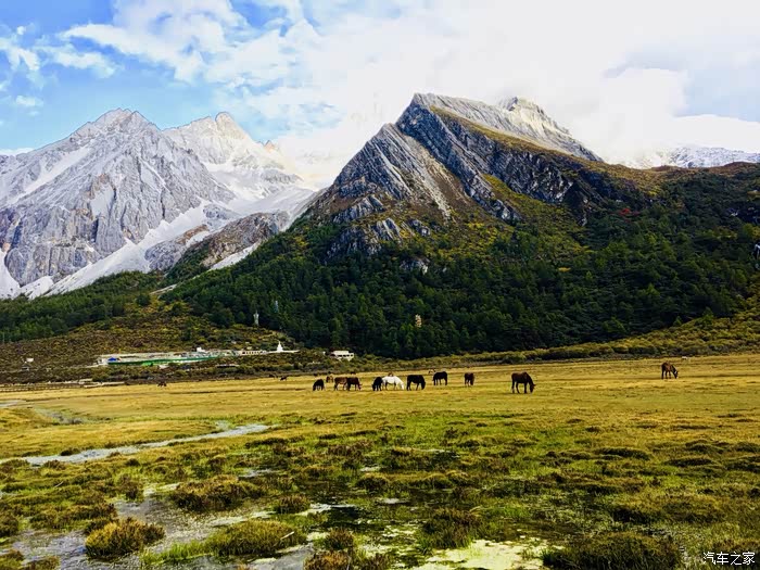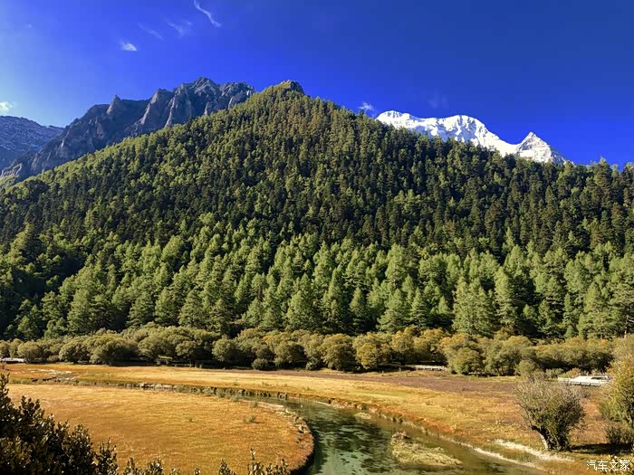 抬眼望去,川流不息的小溪,清澈见底;漫山遍野绿油油的小树,配着枯黄的草地,十分惊艳;那若隐若现的雪山,深蓝色的天空和棉花糖般的云朵,色彩丰富印入眼帘。