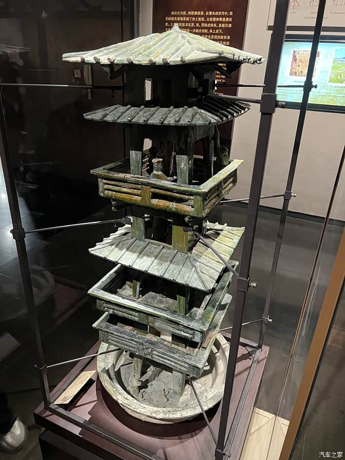 二层挑台四角各有一弓弩守卫,弓弩各向四角斜45°方向瞄准。楼内各置陶俑对案席坐,二层置双案三人,三层置二人对坐。陶楼制作古朴精致,釉色纯正,不仅再现汉代“望楼”形象,更展现了别致的汉代琉璃明器制作工艺。