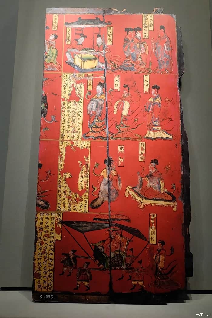 又一件重磅镇馆之宝——北魏司马金龙墓木板漆画,中国首批禁止出国展览文物之一,北魏太和八年文物。该墓为北魏琅琊王司马金龙与妻子姬辰之合葬墓,墓中后室保存有一套完整的彩漆屏风。屏风板正、背面均绘漆画画面,以朱漆为地,以黑漆勾线,采用渲染和铁线勾描的手法,色彩非常浓艳,在艺术风格上酷似顾恺之所作的《洛神赋图》《女史箴图》,呈现出鲜明的东晋、南朝文化特征,反映出当时南方绘画对平城的影响。