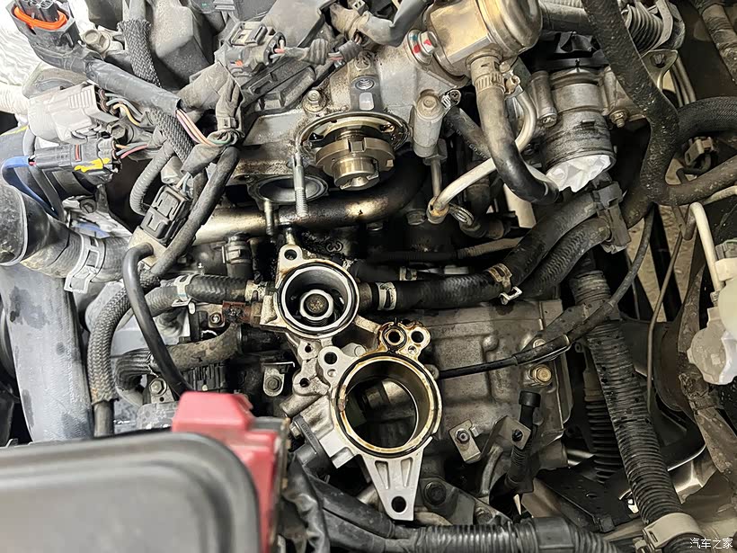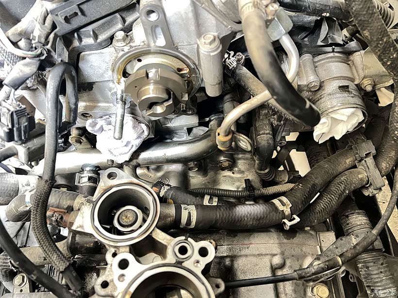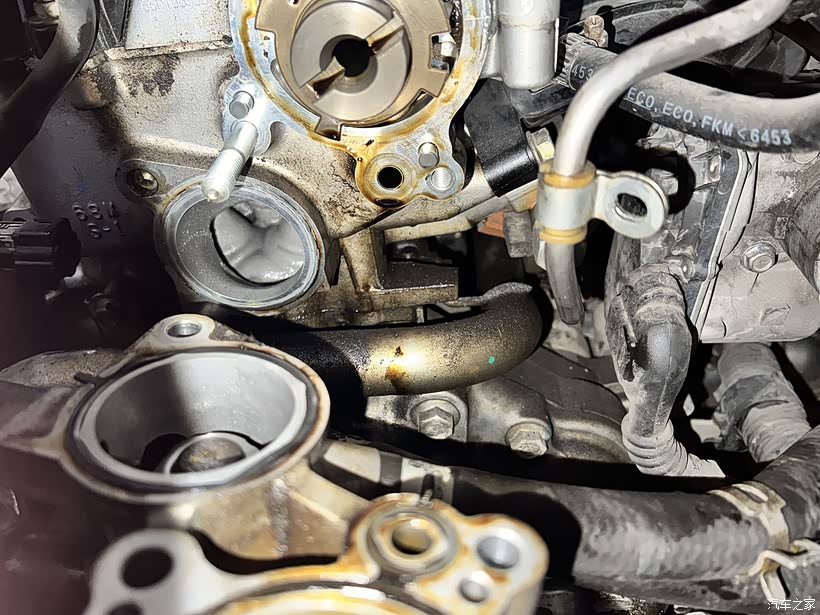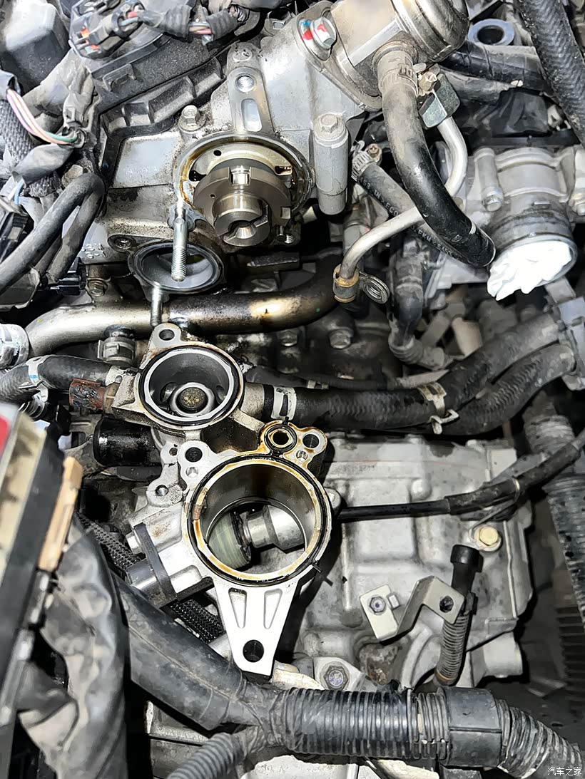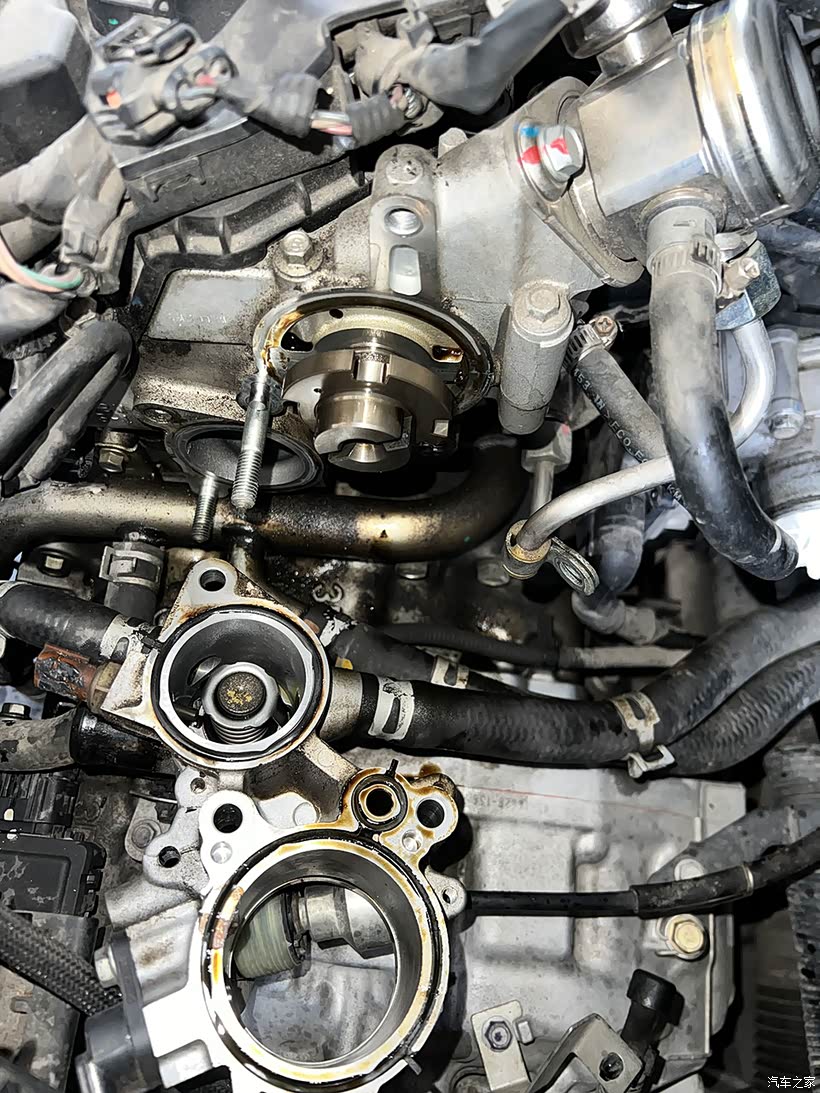 节温器跟真空泵座一体设计,拆下来见到里面的机油都烤焦了。