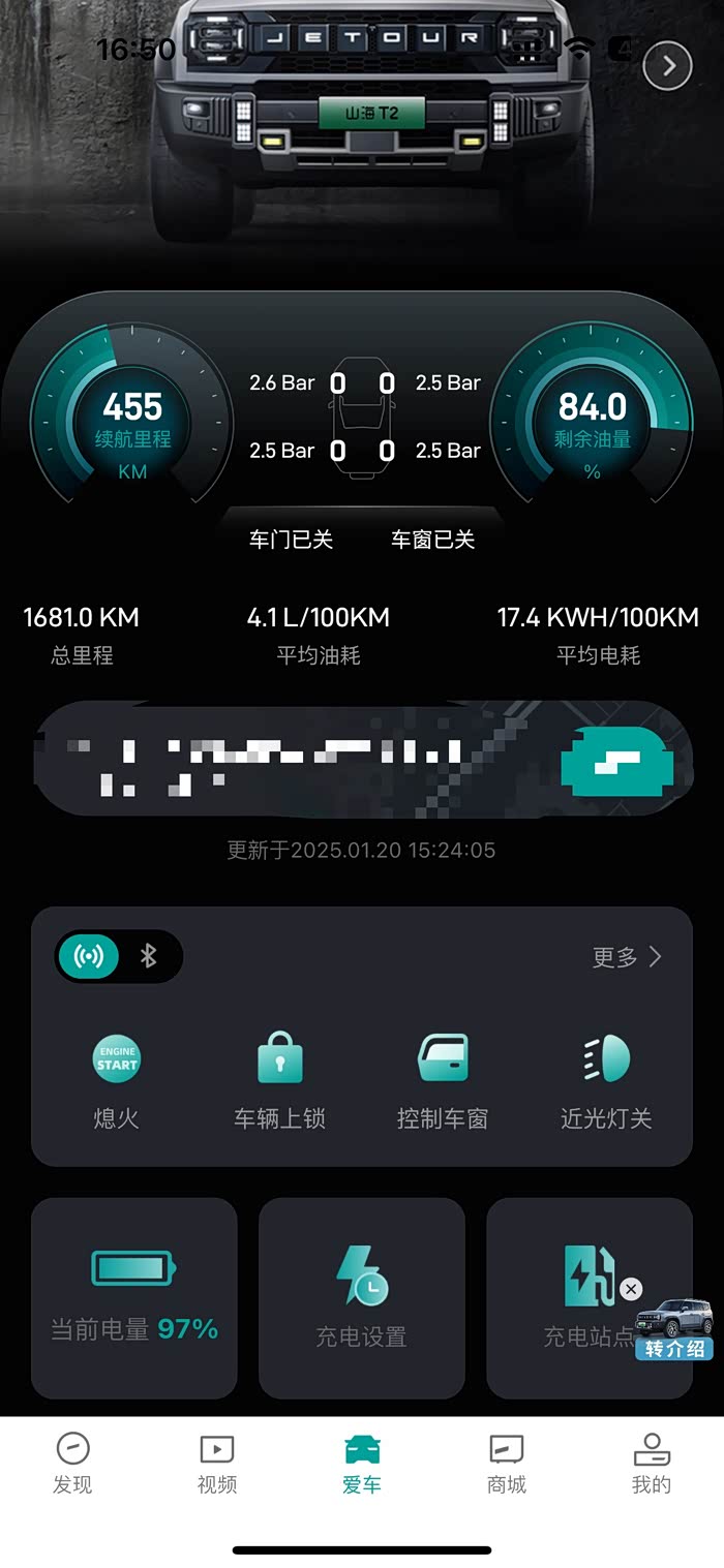 用车情况:车出厂日期为11月20日左右,我12月10号左右提的车,车开起来动力不是足,是相当及其足,每次我都提醒自己别嘚瑟,别超速,别飙车,到现在我油门就没踩到底过,跑高速提速到120都感觉自己有点反映不过来,后驱的推背感及其明显,等个红绿灯,起步来个运动模式,那真是专治各种不服,车里静音也很好,但是因为是方盒子造型,高速100/110/120风噪逐级增加,但是媒体音量7档就基本可以忽略了;有人说发动机声音大,这个我不敏感,以前开的轿车年长,感觉比以前的动静小多了(发动机平常转速1300,高速转速记得是2400还是2900来着,开车没拍照),换车前开媳妇儿的宝马3系运动版,感觉发动机声音比T2大多了;空间很大,我200斤胖子,坐到驾驶座,后排空间也足够大,很舒服;车机的安全设置逻辑很合理,这个以后有时间发帖慢慢说;目前开了1600多公里,销售说前期最好混动模式,发动机也多用用,我们这冬天也冷,基本上我一直也混动模式开,电池是磷酸铁锂的,充满不充满、快充慢充、浅充浅放什么说法都有,我也正在总结经验,现在基本就是混动模式、强制保电30、标准或者运动,充电随心情,快充有时候100有时候95,慢充就100。前几天跑了趟高速(混动+标准+强制保电50-70),来回500多公里,满油满电,时速110-120,空调25度三挡,气温零下5到零下15,音响、充电器正常使用,保电50时电量最低48,保电70时电量最低68,然后费用我算的是1公里5毛钱的样子(油单价7.4、电单价0.75),市区就多一些6-7毛1公里的样子,因为我混动模式,速度上50发动机就介入了,2吨多的车,这油耗我满意;然后就是冬天电池的续航,就最近认真算了次,还是上面说的混动模式和用车情况,冬天零下5-零下15度,上下班各三公里的样子,满电100到电量30,跑了约70公里。发现的问题:车机是4.0.7版本,没有OTA更新,不过没有出现过大问题我也没去售后更新,隔壁猛龙都更新了好几次了,车机偶尔慢,买车前看别人发过类似的问题,所以知道怎么处理,启动后开机慢,就等,最多2分钟,她就醒了;车机4G网络,地下车库没信号,后期能换5G芯片吗,买了个5G随身WiFi,中兴F50,结果车机不支持5G,只能工作在2.4G频段;因为我没升级4.0.8/4.0.9,车机统计里程、油耗、电耗的这些功能可是做的不好,有时候真看不懂,就自己拿手机记一记算一算,你就弄个总里程油耗电耗、自清零油耗电耗、然后描述的就是通俗一点,一眼就能看出来我跑了多少公里,大概费了多少油多少电就行;方向盘前的那个屏幕,右侧不是能切换不同显示的内容么,但是不能保存,每次启动都恢复初始界面了;网易云音乐,每次车停放时间长了,启动后播放的就是默认列表歌曲,不是我上次播放的歌曲进度;然后就是因为地下车库网络信号不好,用户总是退出,得有网了再次登录;座椅、后视镜设置一直没弄清怎么个流程,有时候我媳妇儿开车后,我上车,座椅后视镜设置就不识别我,还是她的设置(我的用户登录设置的不同步座椅后视镜);车内车顶那个摄像头像素不是一般的糊;“你好小捷”有点傻;后备箱有点小;高德没有红绿灯读秒;车机的wifi有时候不自动连接;四驱锁越野模式什么的一直没机会试过,不好评价,不过某音有各种穿沙爬坡视频,应该不差,后期有机会用四驱我试试,哦对,混动模式下是四驱,时速过50就四驱了,具体工作模式还在研究中。