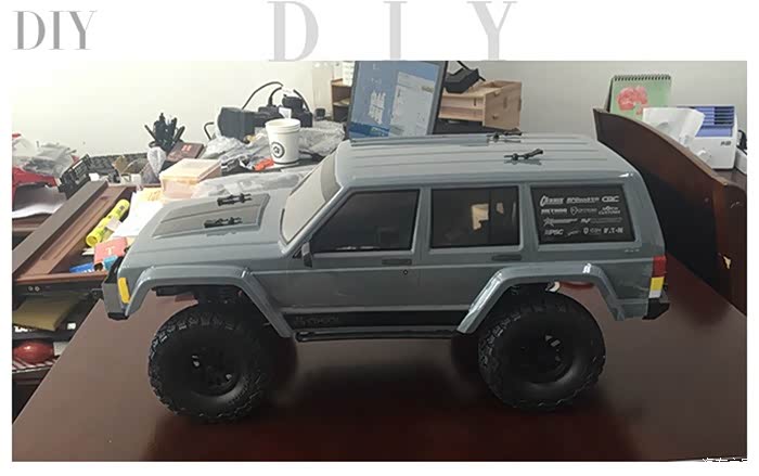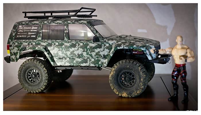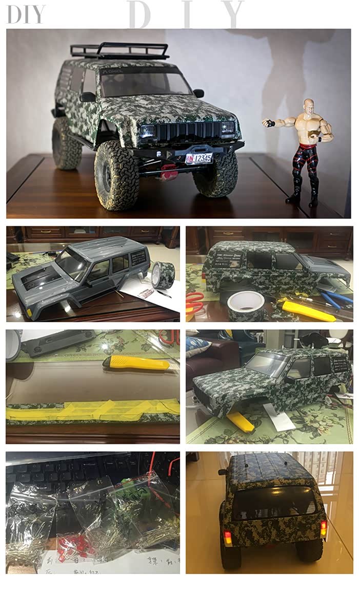 ↑↑此车车架同为90047车架,车壳为原装灰色切诺基软壳,因太大众化,由于软壳采用的透明壳内部喷漆法,所以没法改色。某天灵机一动!!某宝购入迷彩胶带,从下午5点下班贴到晚上12点!!!!!眼睛都要贴瞎有木有,但是最终成品出来的时候心情还是美美哒!