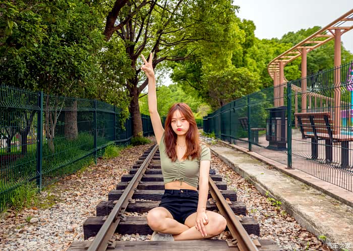 铁轨拍照的注意事项,身体一定要在轨道内,头顶要远离背景的绿色,原因你懂得。