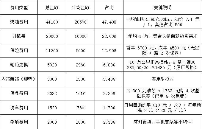 · 2 年总花费:86852 元(含新增 4 次保养 1728 元)