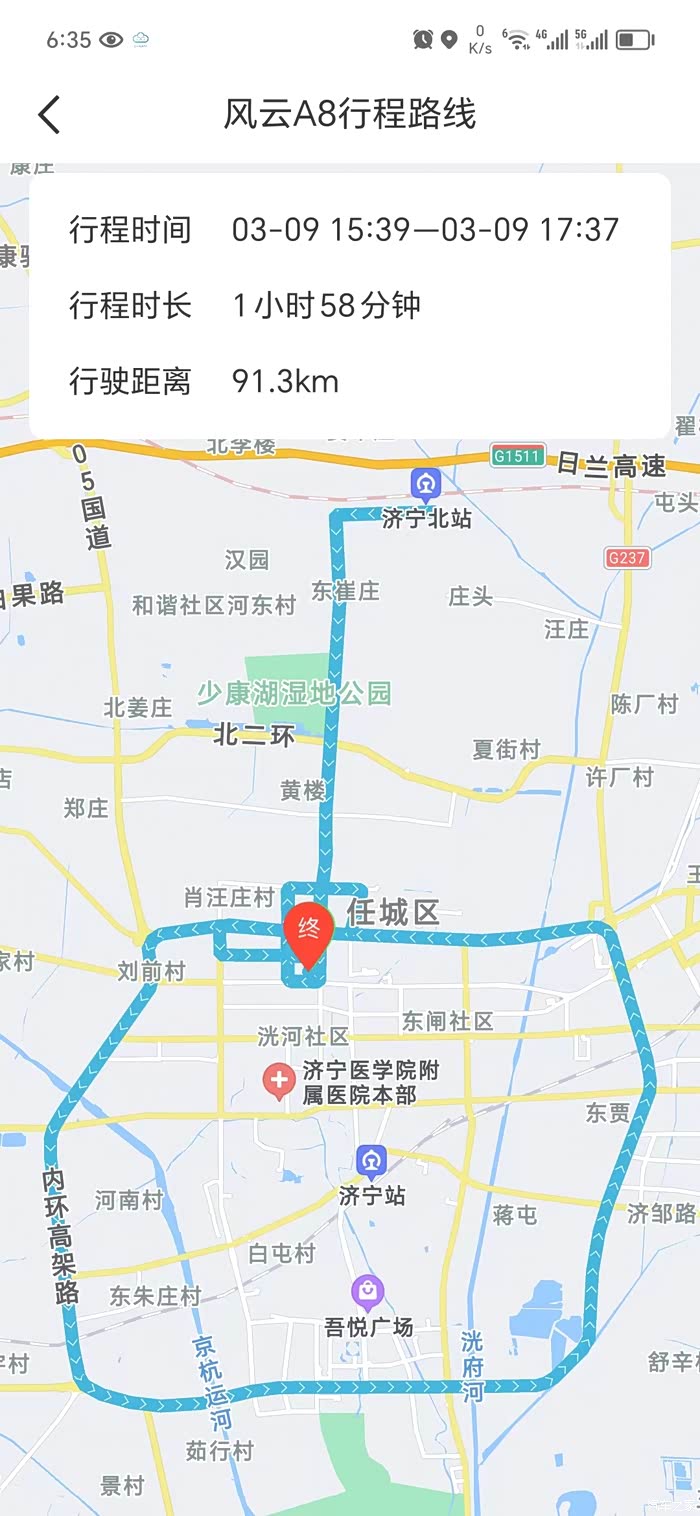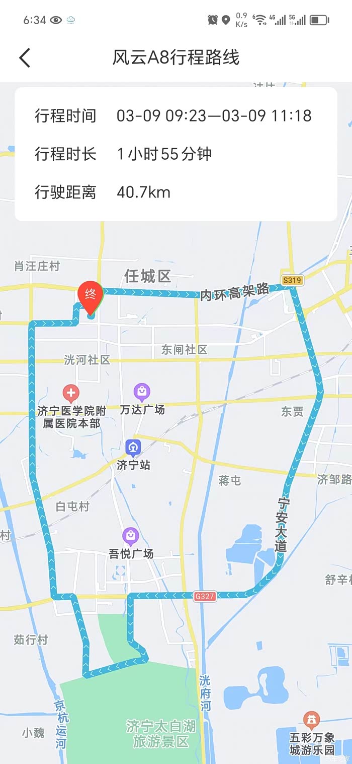 行驶路线第二段,下来高架后,看到还有37%的电量,就往济宁高铁北站跑,返回后看到电量18%左右,就在小区周边道路绕圈圈。