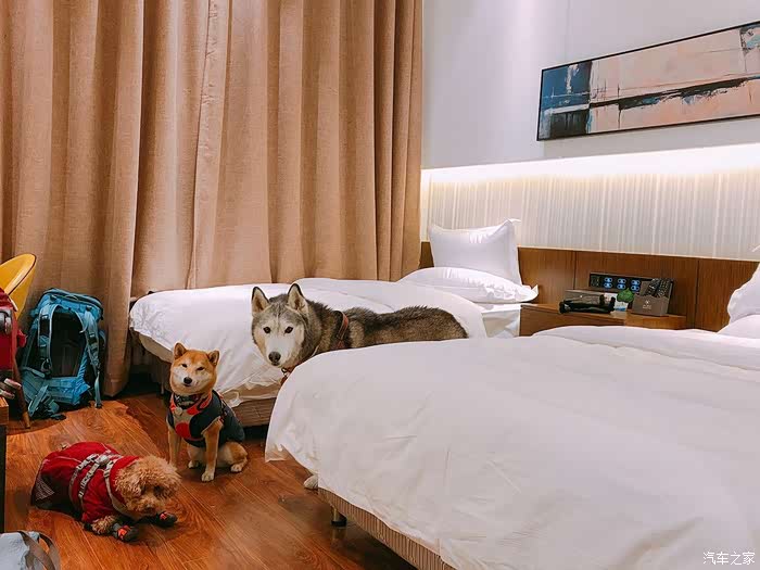 因为冰红茶和三文鱼还有些掉毛,所以给它们也穿上了衣服兜一下,免得酒店里都是狗毛