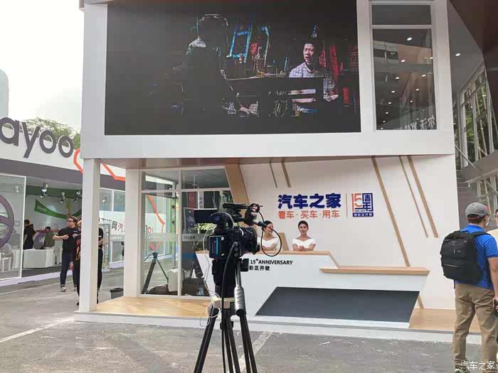 汽车之家的展台,简洁时尚大气,白色底,15周年庆的标志,车友随手礼都是发一枚15周年汽车之家金属车标。