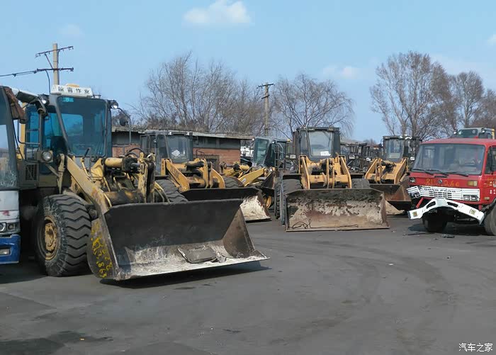 很多吊车集中在一起。这些车相对完整。说是还没有办理完相关手续。