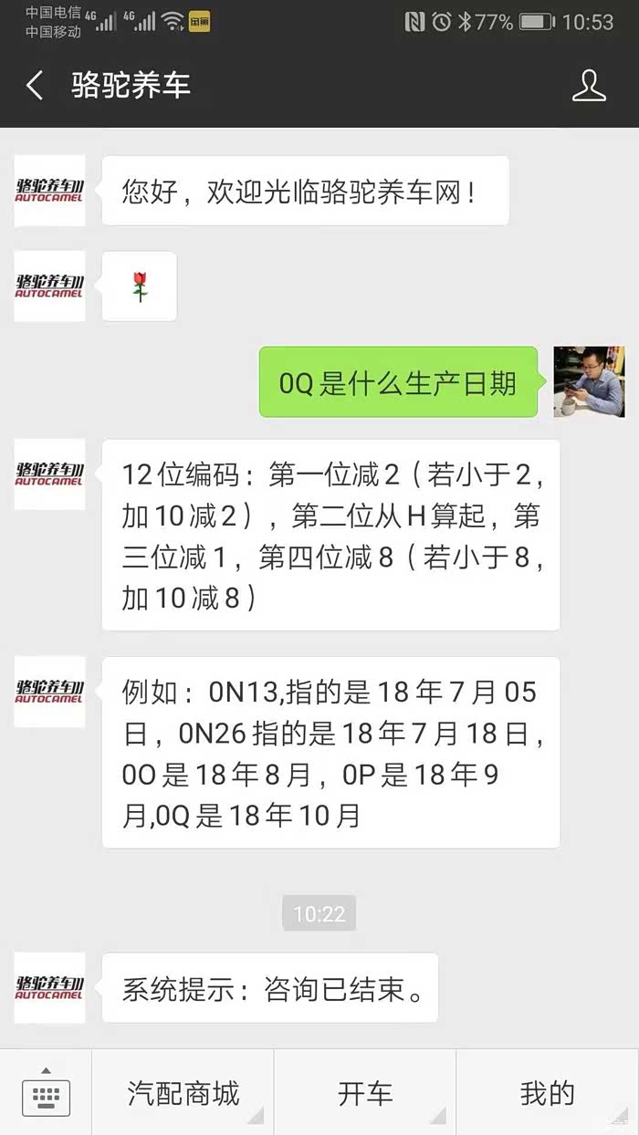 然后第二天就来装了,看了电池编号是0Q49开头的.网上查了下骆驼的生产日期方法,说第一个字是年份.我心想怎么是0开头呢?难道是翻新?问骆驼客服,回复说有2种编号,第一种是8A指18年1月,一种是0H批18年1月.