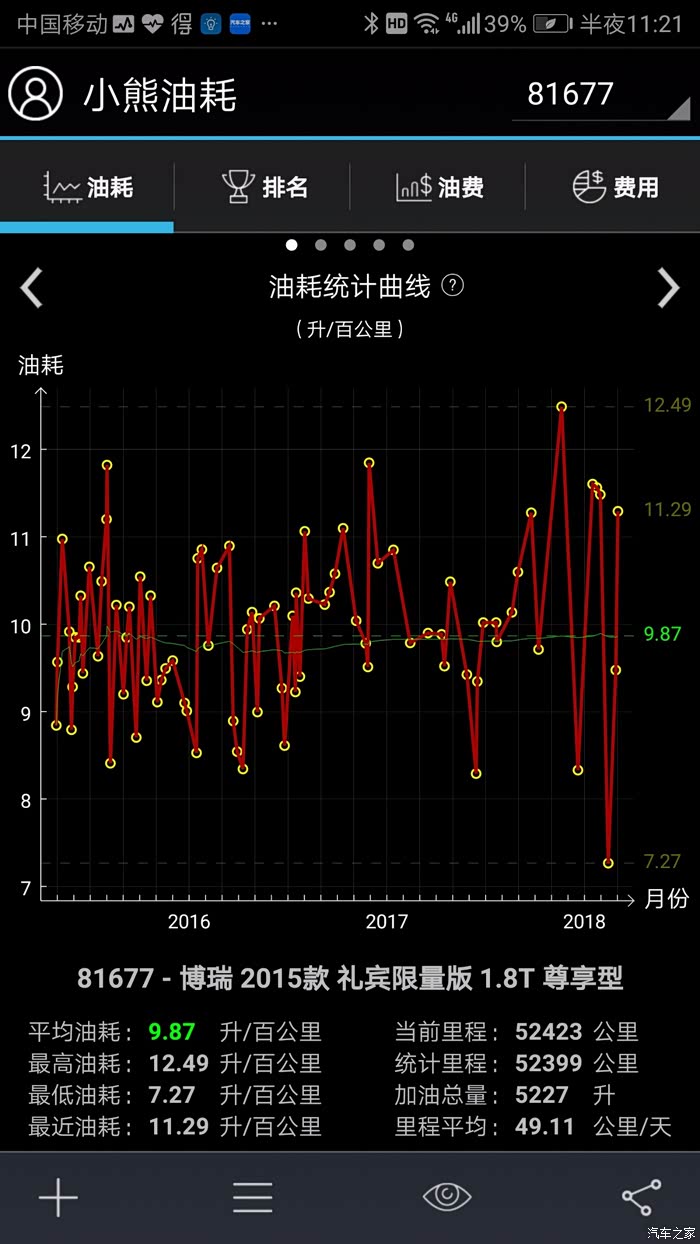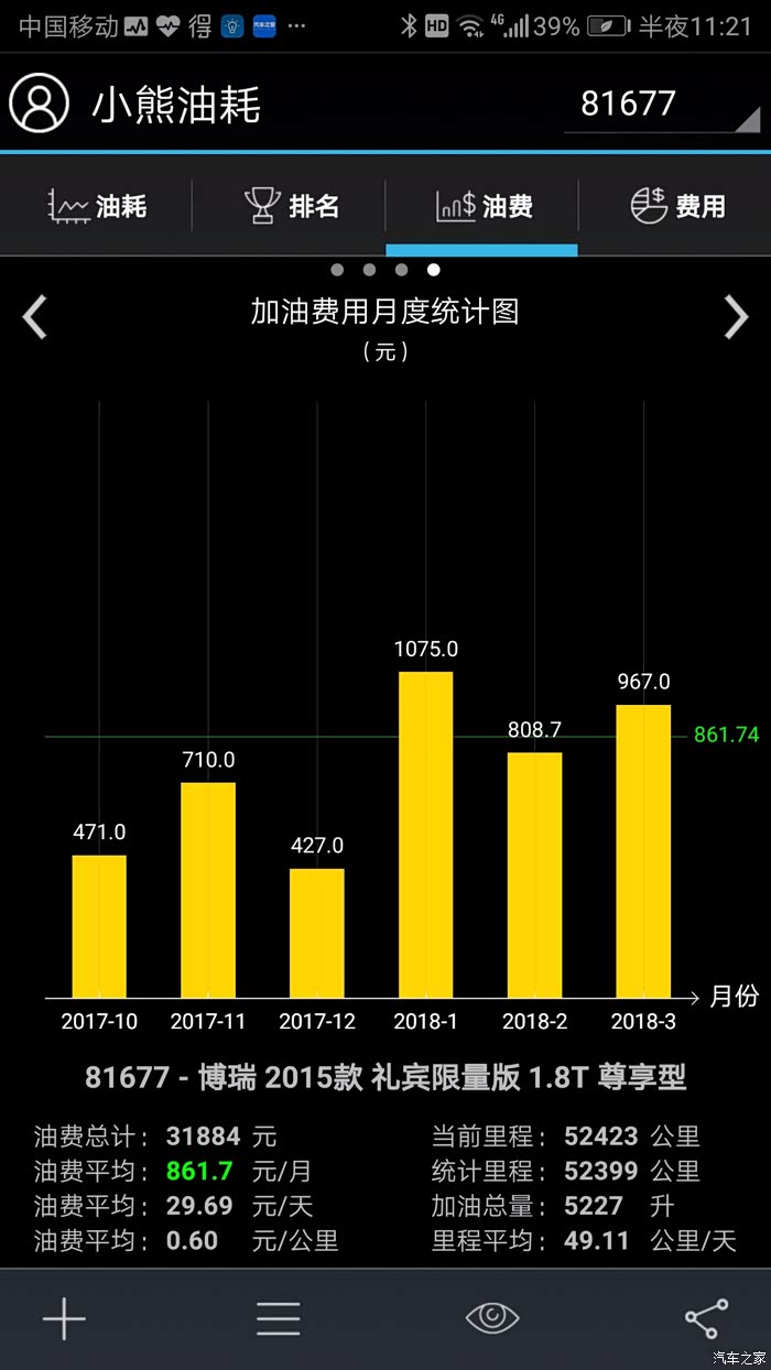 从油耗记录软件上看看:综合平均油耗:9.85L/100km,每公里刚好0.60元,这11000公里花费6600元。