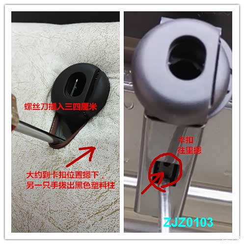 先说下卡扣的结构:一个类似扣子的黑色塑料柱卡在一个正方形的金属槽口中。我先要说下正确的做法, 我自己采用的是笨方法(解扣法)。