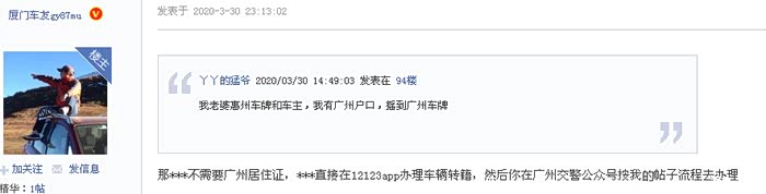本人亲办佛山车夫妻间变更迁入广州,沙湾车管所办理的。因办理之前找过很多资料,论坛攻略,发现都有一些不太完整所以写一个完整的,并把注意事项也写出来,当然,9月20日办理的,算是最新攻略吧!献给有需要的车友们,算是如果有什么疑问看不明白可以跟帖!首先是已获得指标,打印指标书。第二,必须是珠三角国五(第二阶段)的车。不确定的可以上网查询!第三,广州交警微信公众号预约业务,选择变更登记预约--居住地变更迁入--更改共同所有人第四,预约好后,上交警12123办理车辆电子转籍。只要显示网上申请成功就ok!夫妻间变更迁入准备资料: &nb...