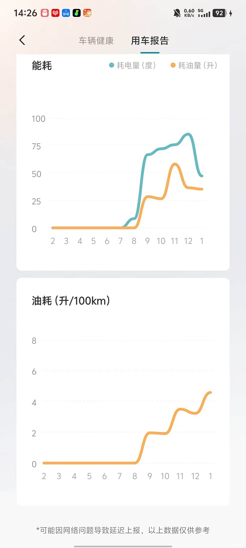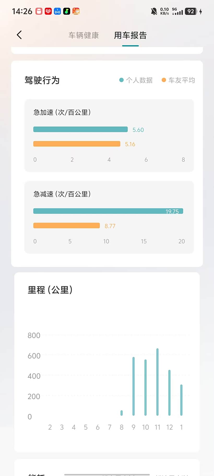 月度里程柱状图挺有意思,清晰反映了我的生活节奏。7月份里程最低,估计是暑假孩子在家,市内活动多但跑不远;11月份柱子最高,超过了600公里,那会儿秋高气爽,跑了几趟跨区办事加上短途自驾,用车就频繁了。能耗曲线图也印证了这一点,8月份之后,随着跑高速和长途的情况增多,图表上代表耗油量的橙色线明显抬头了,油耗也从之前长时间的0升/百公里,逐渐升到接近5升/百公里。这说明这车在长途高速工况下,还是会更多依靠燃油,但总体能耗控制得依然在合理范围。