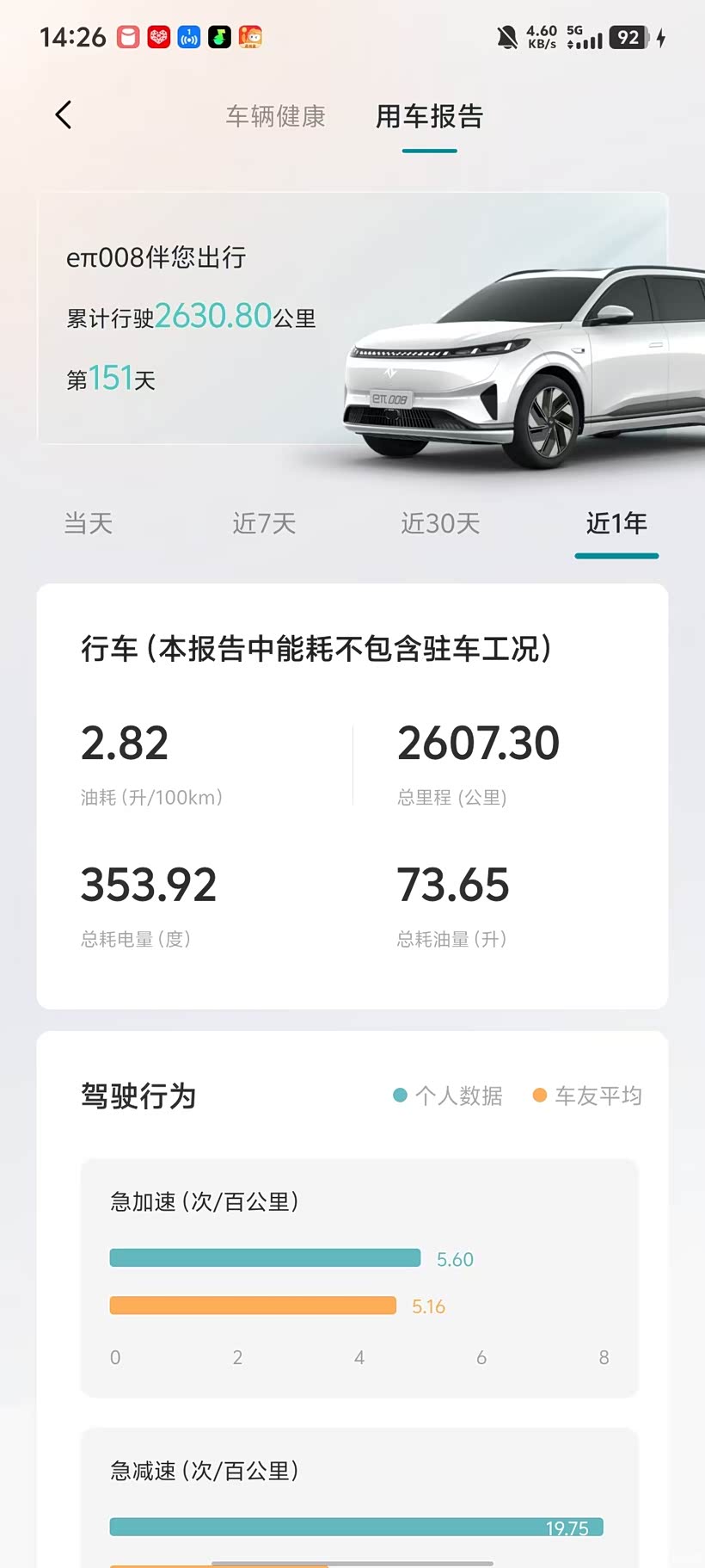 从报告上看,到今年1月份,咱这车累计跑了2600多公里,用了151天。可能有人觉得跑得不算特别多,但这基本就是我家最真实的使用状态:日常通勤、周末带家人近郊转转、偶尔跑个短途。最让我心里踏实的,是那个“近1年”维度下的综合数据:平均油耗显示是2.82升/百公里。对于这么一个大块头的6座车来说,这个能耗数字,我个人是相当满意的。报告里详细列出了总耗电353度多,总耗油73升多,大部分时间用电,花费上确实省了不少。