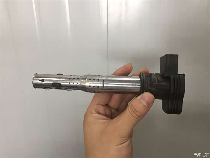 拆掉点火线圈是为了查看汽缸内部积碳的状况和检查火花塞的状态的,Q5的点火线圈真的可以用超级长来形容。外部的一层铁套筒是一种屏蔽层,主要是用来隔绝能量损失,增强点火信号的。
