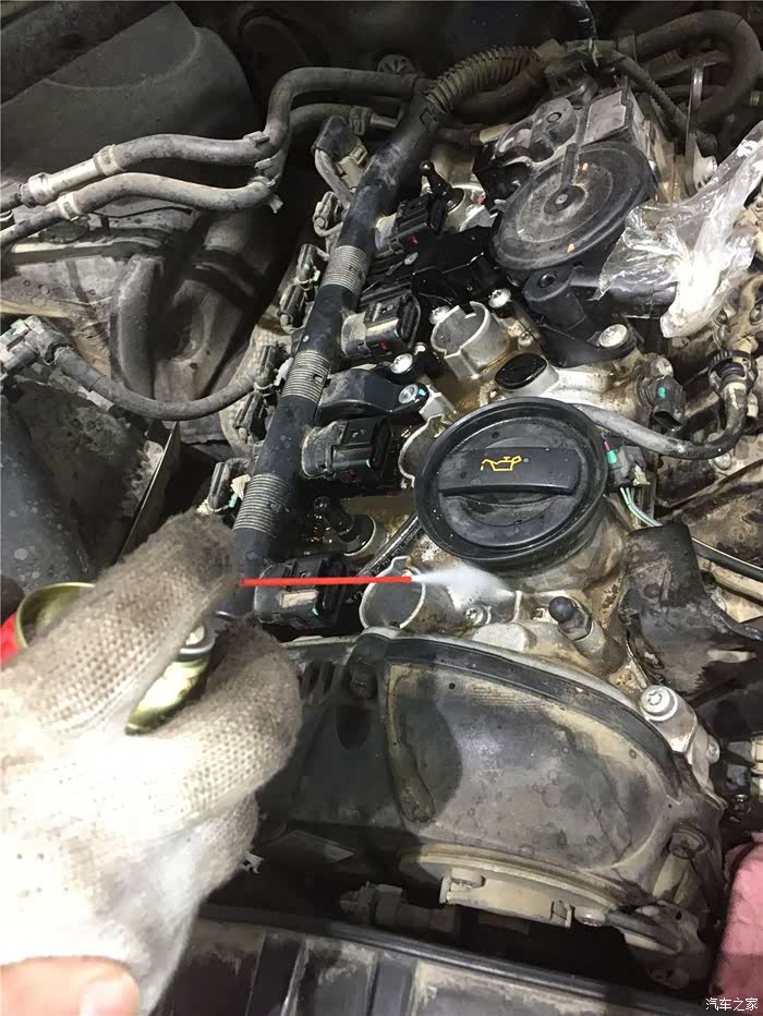 发动机由于下排气的压力很高,导致曲轴箱通风系统根本无法侧地将内部的压力释放。所以气门室罩盖上面已经渗漏处了很多的机油,渗漏出来的机油不是好事,发动机在运转的时候有很高的温度,点燃这个渗漏出来的机油只是分分钟的事,,所以我用化油器清洗剂及时的清除掉了。