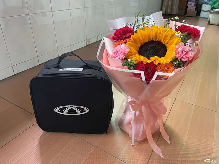 ↓↓↓还顺道领了个奖,32A充电枪一把,6KW放电枪一把,鲜花一束;同店好像只有2个奖,另一位老兄的也是增程四驱,月影灰,黑内。我估计是看我们俩年纪比较大友情给的
