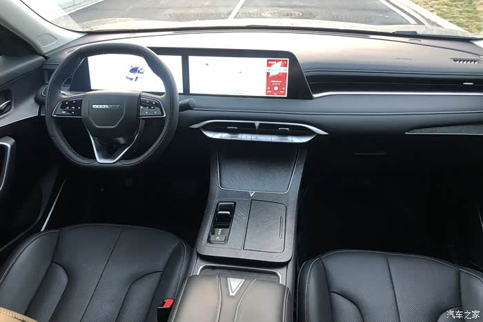 前舱采用对称性布局,设计风格偏向于简约风,偏向于驾驶位的12.3寸的双联屏设计,对驾驶员更加友好。